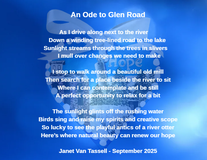 Inspired by Janet’s poem “An Ode to Glen Road”, this heart reminds us that nature, creativity, and community can restore our spirits and renew our hope.